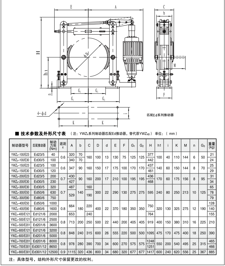 電力液壓制動(dòng)器是使機(jī)械中的運(yùn)動(dòng)件停止或減速的機(jī)械零件。俗稱剎車、閘。制動(dòng)器主要由制架、制動(dòng)件和操縱裝置等組成。有些制動(dòng)器還裝有制動(dòng)件間隙的自動(dòng)調(diào)整裝置。為了減小制動(dòng)力矩和結(jié)構(gòu)寸, 制動(dòng)器通常裝在設(shè)備的高速軸上,但對(duì)性要求較高的大型設(shè)備(如礦井提升機(jī)、電梯等)則應(yīng)裝在靠近設(shè)備工作部分的低速軸上。有些制動(dòng)器已標(biāo)準(zhǔn)化和系列化,工廠制造以供選用。